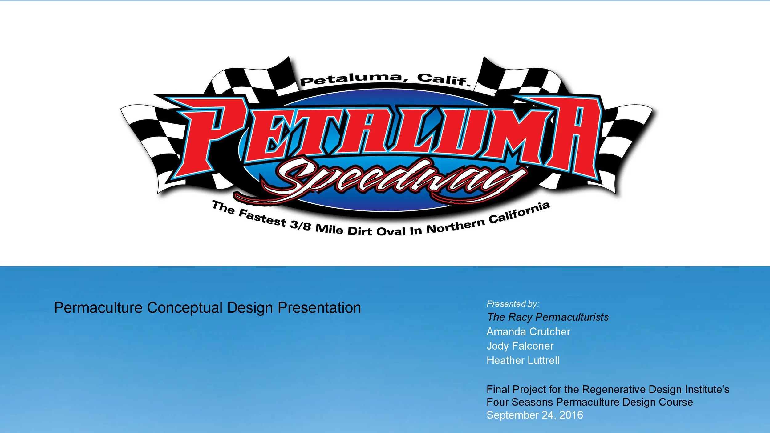 In 2016, I took a yearlong permaculture class at the (former) Regenerative Design Institute at the Commonweal Gardens in Bolinas. The class offered a unique exploration of sustainable, nature-based solutions. Throughout the year-long class, we learned permaculture principles that make ecological systems self-sustaining such as energy and water supply systems, healthy communities, meaningful and fulfilling work, ecological economies, and global political movements for change. Over the last half of the class, we broke into small groups and chose a site to apply what we were learning. Our group decided to focus on our beloved Petaluma Speedway. It was rewarding looking at a site that on the surface seems antithetical to permaculture principals.